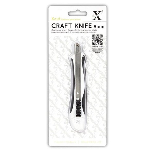 Xcut 9mm craft knife with cushioned grip, cuts paper, cardstock, thin foam and vellum. It has a snap off interchangable blade, a retractable blade and even 2 spare blade strips are included!