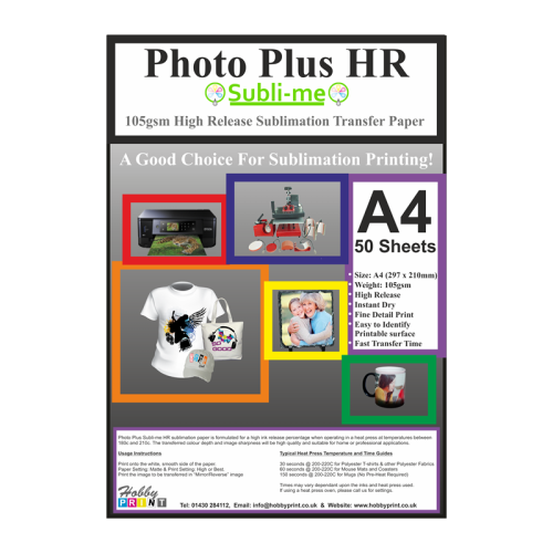 50 sheets PhotoPlus HR, A4 High Release, Multi-Surface Sublimation Transfer Paper - 105gsm.