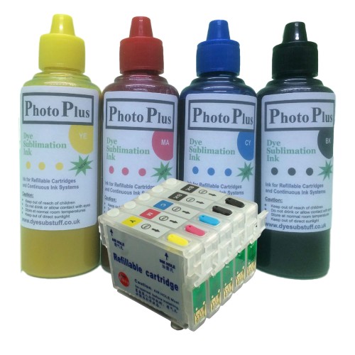 A set of 4 refillable ink cartridges and 400ml of Dye Sublimation ink. The cartridges are fitted with auto reset chips and manufactured in a clear see through body for easy filling. They are supplied as a set, fitted with the latest version chips to work with the most recently produced printer models and firmware.