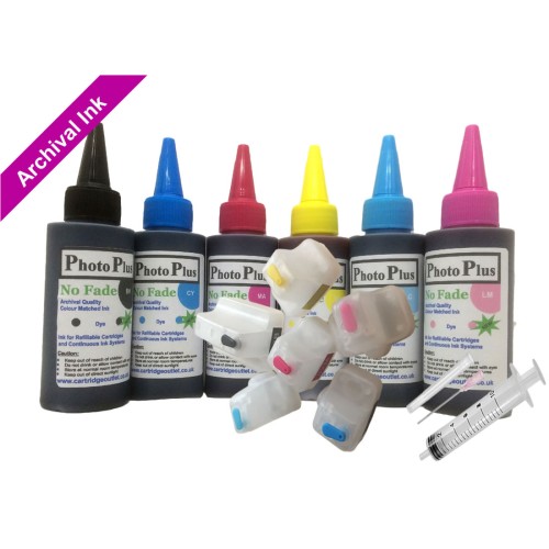 The set consists of Black, Cyan, Magenta, Yellow, Light Cyan and Light Magenta empty cartridges and 6 bottles of ink, available in 30ml, 50ml & 100ml bottles, selectable from the "Options"