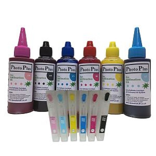 A set of 4 refillable ink cartridges and 600ml of Dye Sublimation ink. The cartridges are fitted with auto reset chips and manufactured in a clear see through body for easy filling. They are supplied as a set, fitted with the latest version chips to work with the most recently produced printer models and firmware.