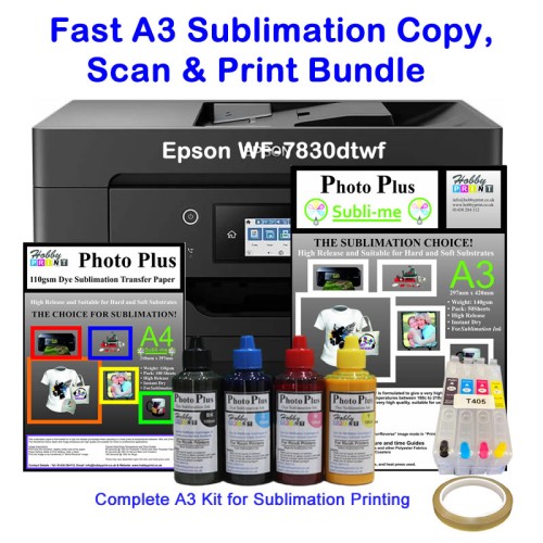 Tags: A3 sublimation printer, Epson WF-7830, with HobbyPrint® sublimation printing kit, HobbyPrint, dye sublimation, A3 sublimation bundle, T-shirt printing kit, sublimation starter pack